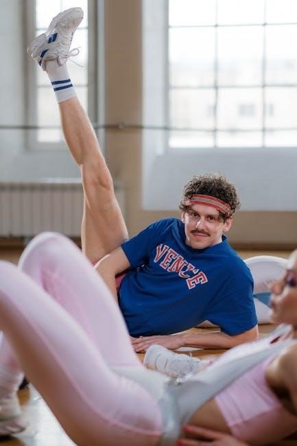 Bicycle crunches‚ a core-strengthening staple‚ are often included in comprehensive aqua aerobics exercises routines PDFs. Begin by leaning back slightly in chest-deep water‚ supporting yourself with hands lightly behind your head.